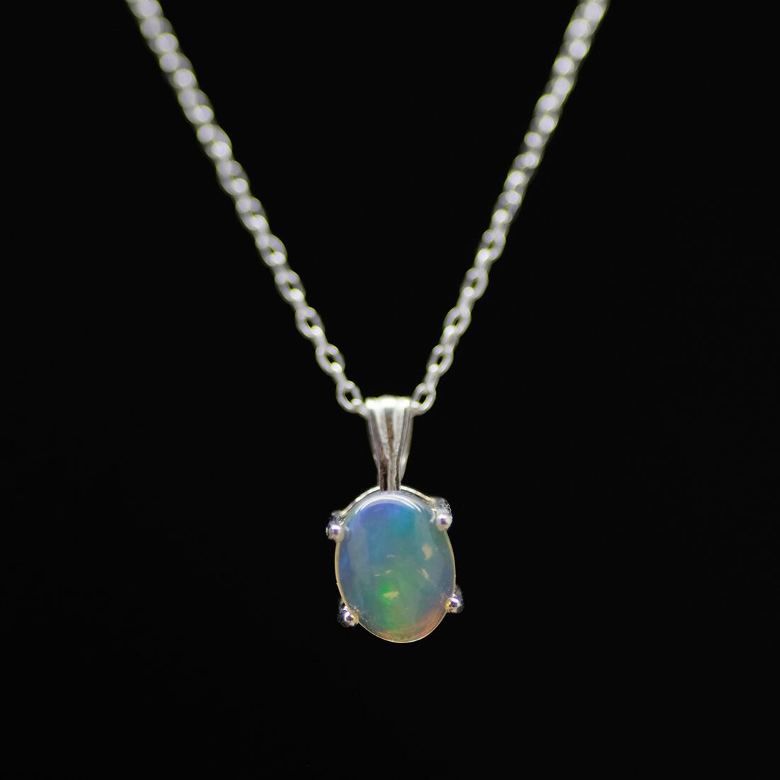 使用している天然石と素材/宝石質エチオピア産オパール(蛋白石)カボション8×6mm(約0.8カラット)シルバー枠留め、40cmアズキチェーンネックレス ※シルバー925 チェーンを含めた重さ:約1.6g