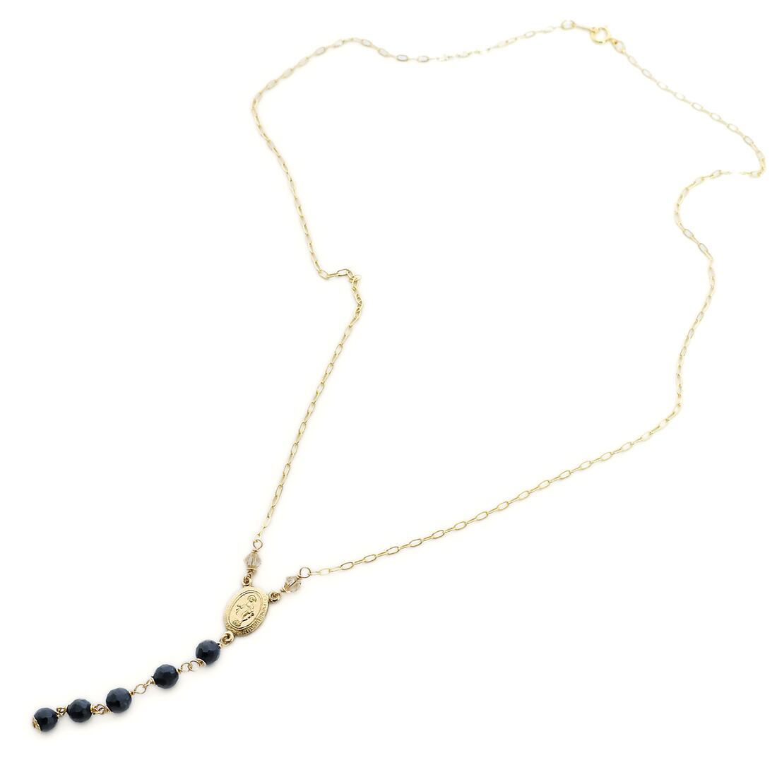 マリアメダイがポイント。濃紺サファイアとスワロフスキーを組み合わせたチェーンネックレスです。