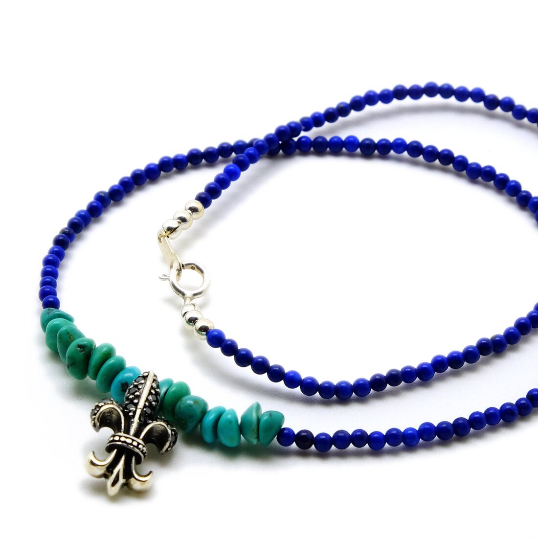 高貴な印象の百合の紋章を中心に、ターコイズとラピスラズリを組み合わせたネックレスです。