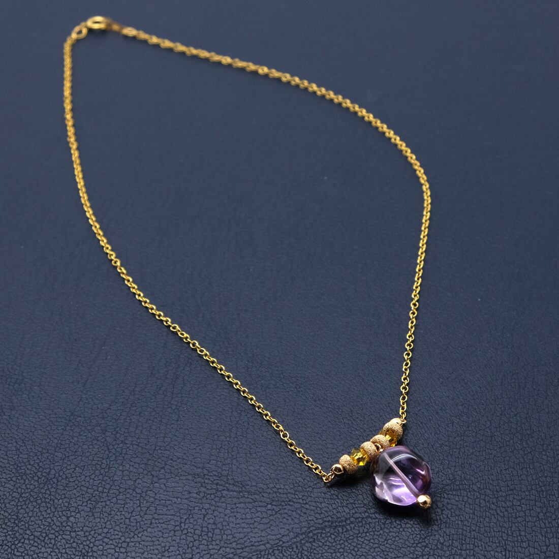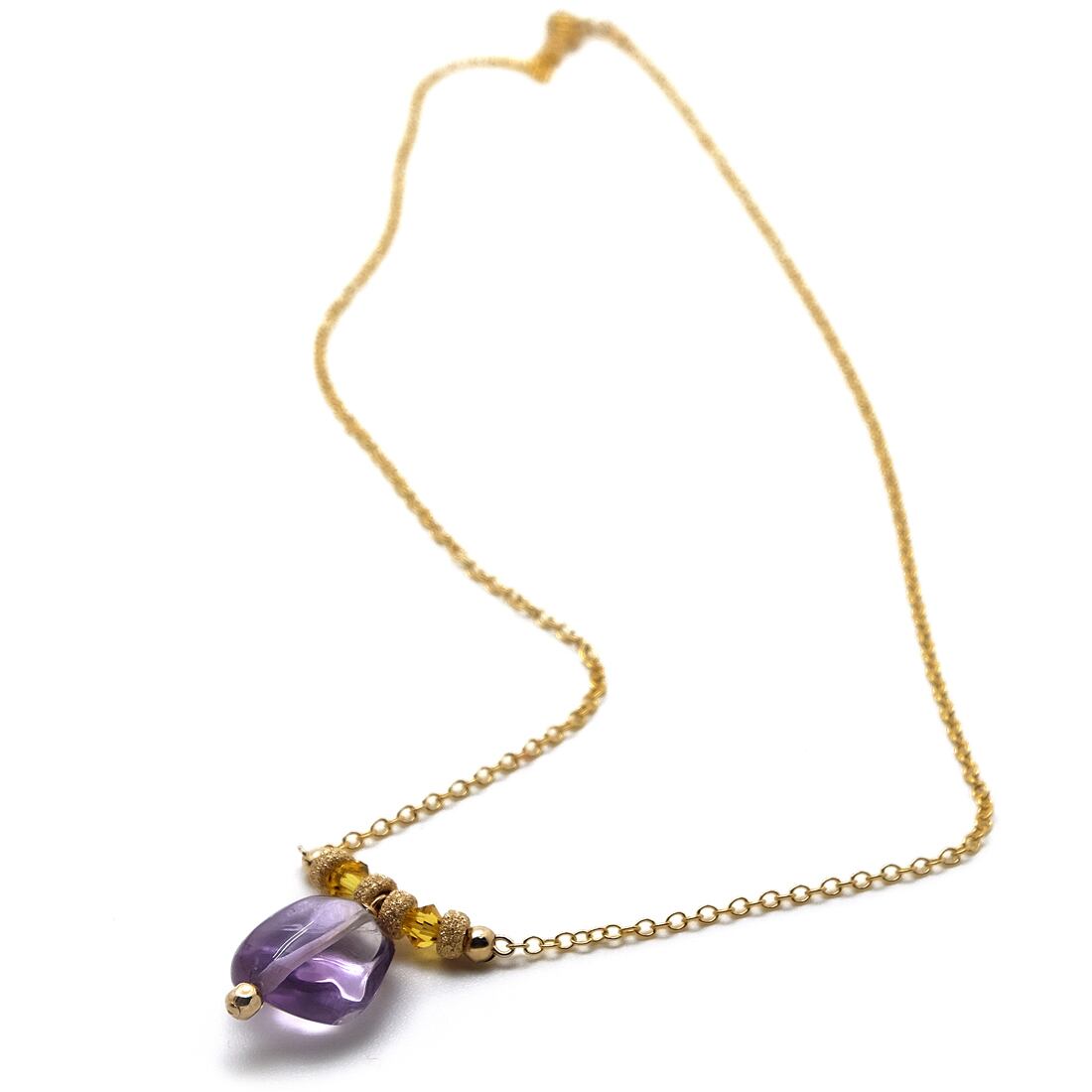 ほんのり黄味をたたえたアメトリン(紫黄水晶)をポイントにした、14金ゴールドフィルドネックレスです。