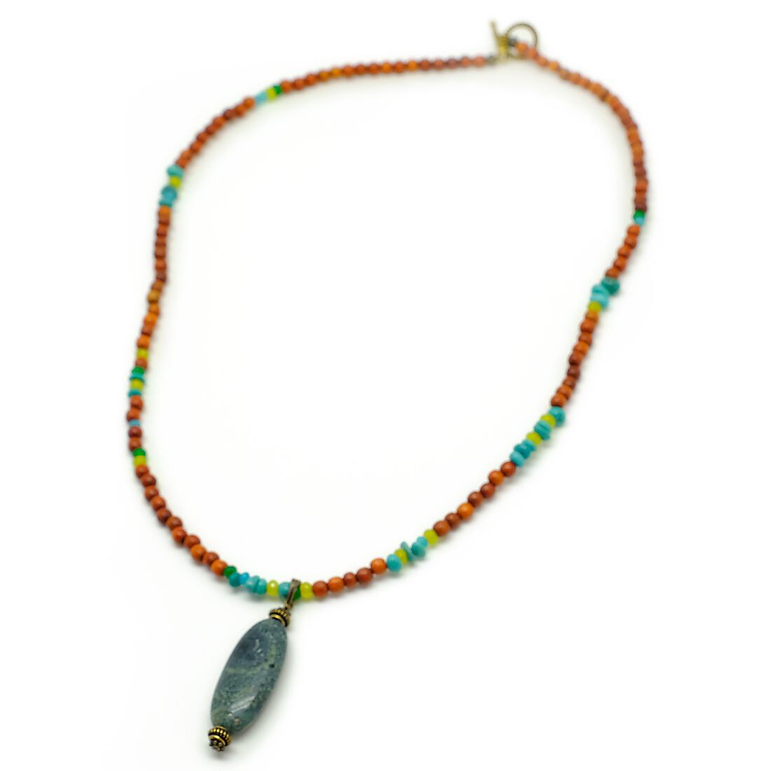 レッドカラーのウッドにカンババジャスパーがポイント。ナチュラルテイストのネックレスです。