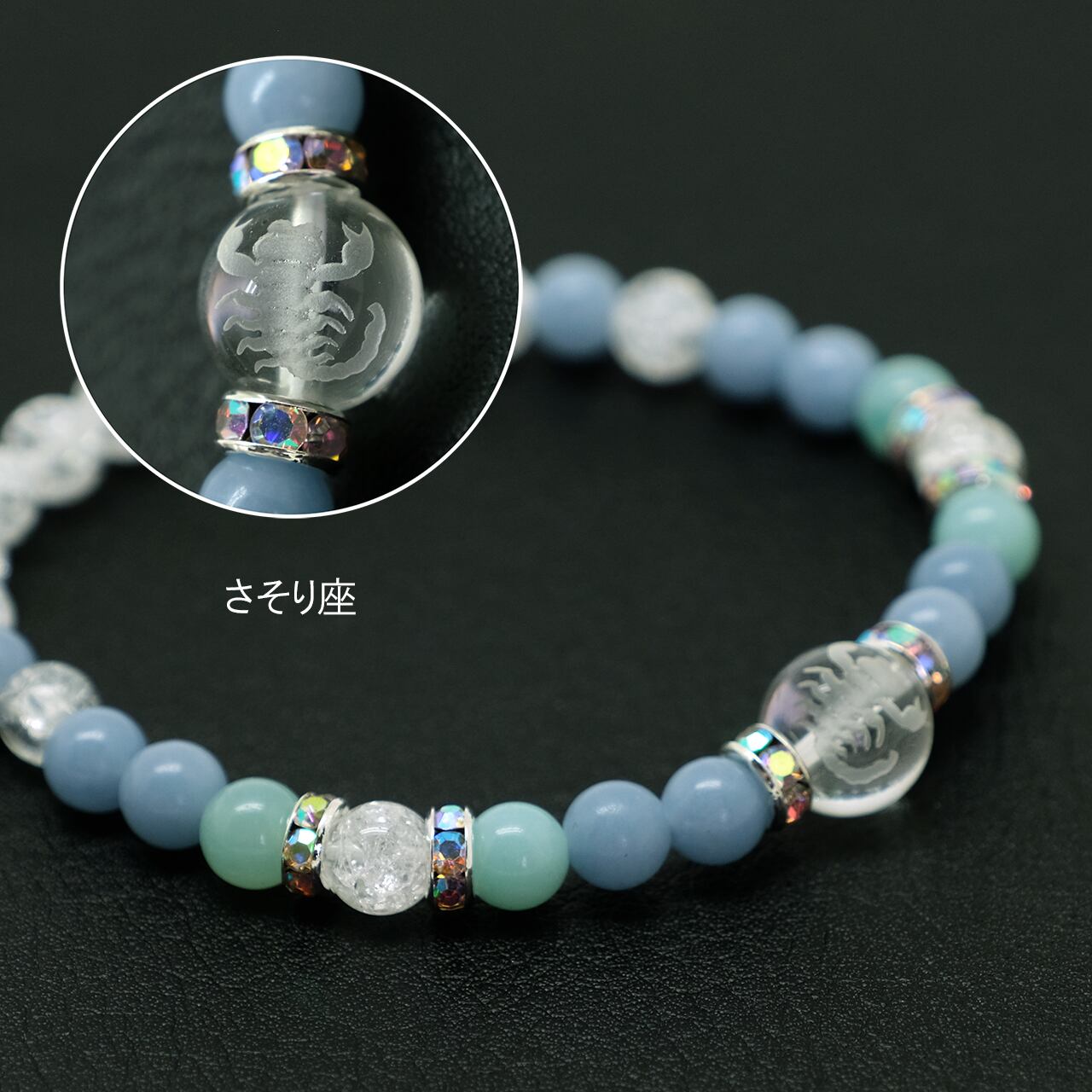 使用している天然石と素材/(共通)星座の彫刻入り水晶10mmラウンド、クラック水晶6mmラウンド、ラインストーンロンデル、シリコンゴム