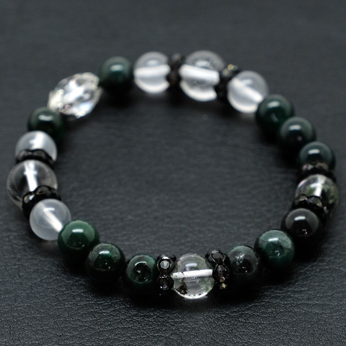 使用している天然石と主な素材/クローバー彫刻水晶10mmラウンド、水晶ライスカット約14×8mm、ミルキークォーツ(乳石英)8mmラウンド、ガーデン水晶(庭園水晶)8mmラウンド、ブラッドストーン(血玉髄)8mmラウンド、花座、ラインストーンロンデル、シリコンゴム