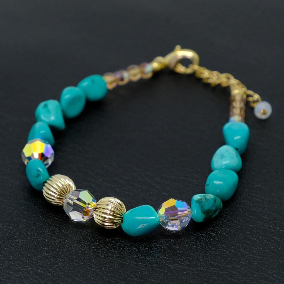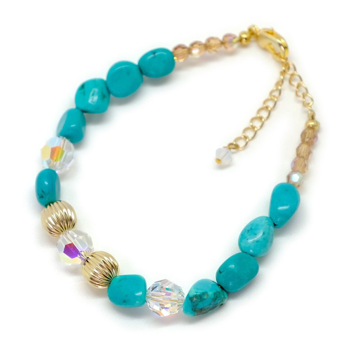 使用している天然石と主な素材/グリーンターコイズ中粒タンブル、スワロフスキー8mm&4mmラウンドカット、メタルビーズ、ゴールドカラーメタルカニカン、アジャスタ