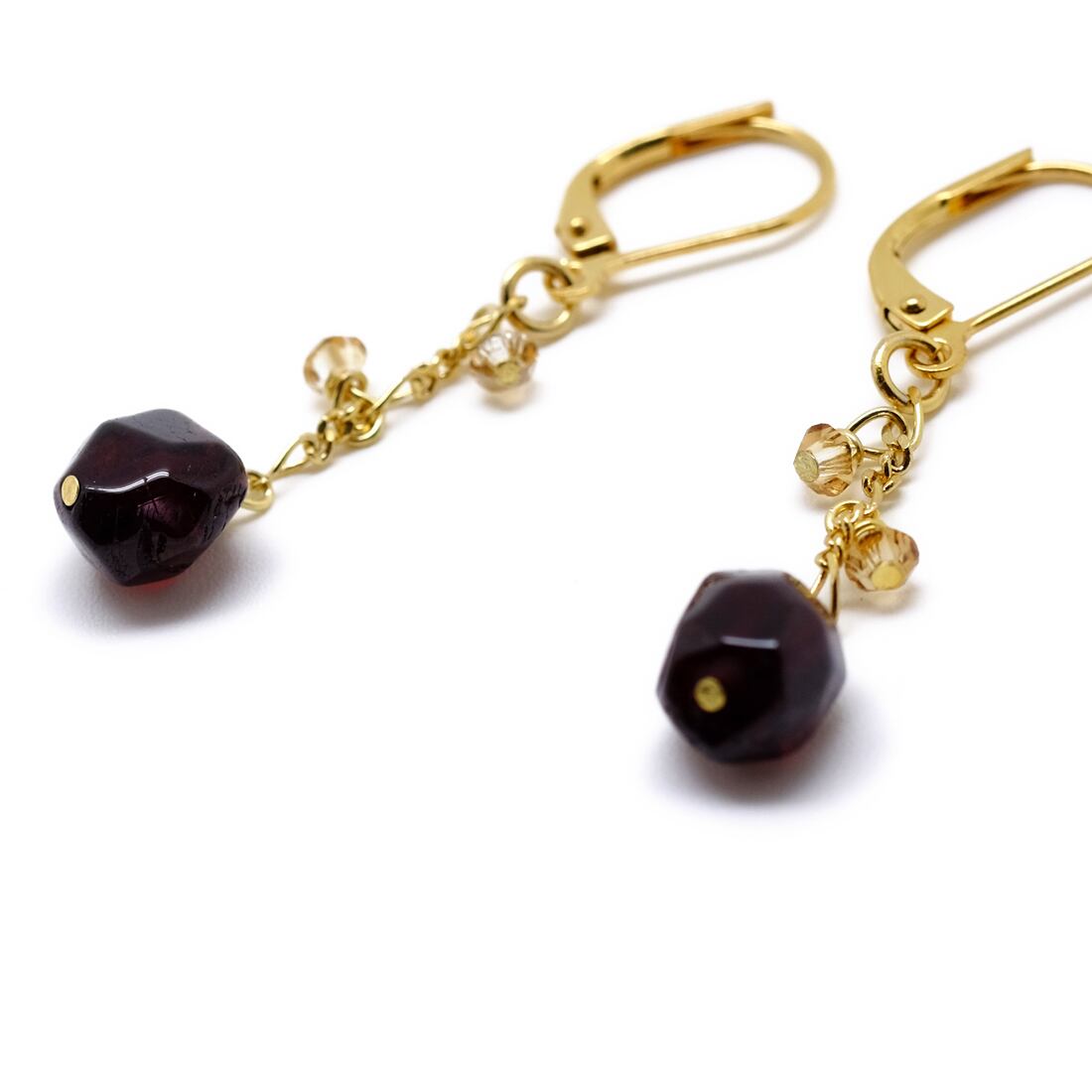 ガーネット(柘榴石)タンブル(約7×7×6mm)、アズキチェーン、スワロフスキー、フレンチフックピアス ※ゴールドメッキ