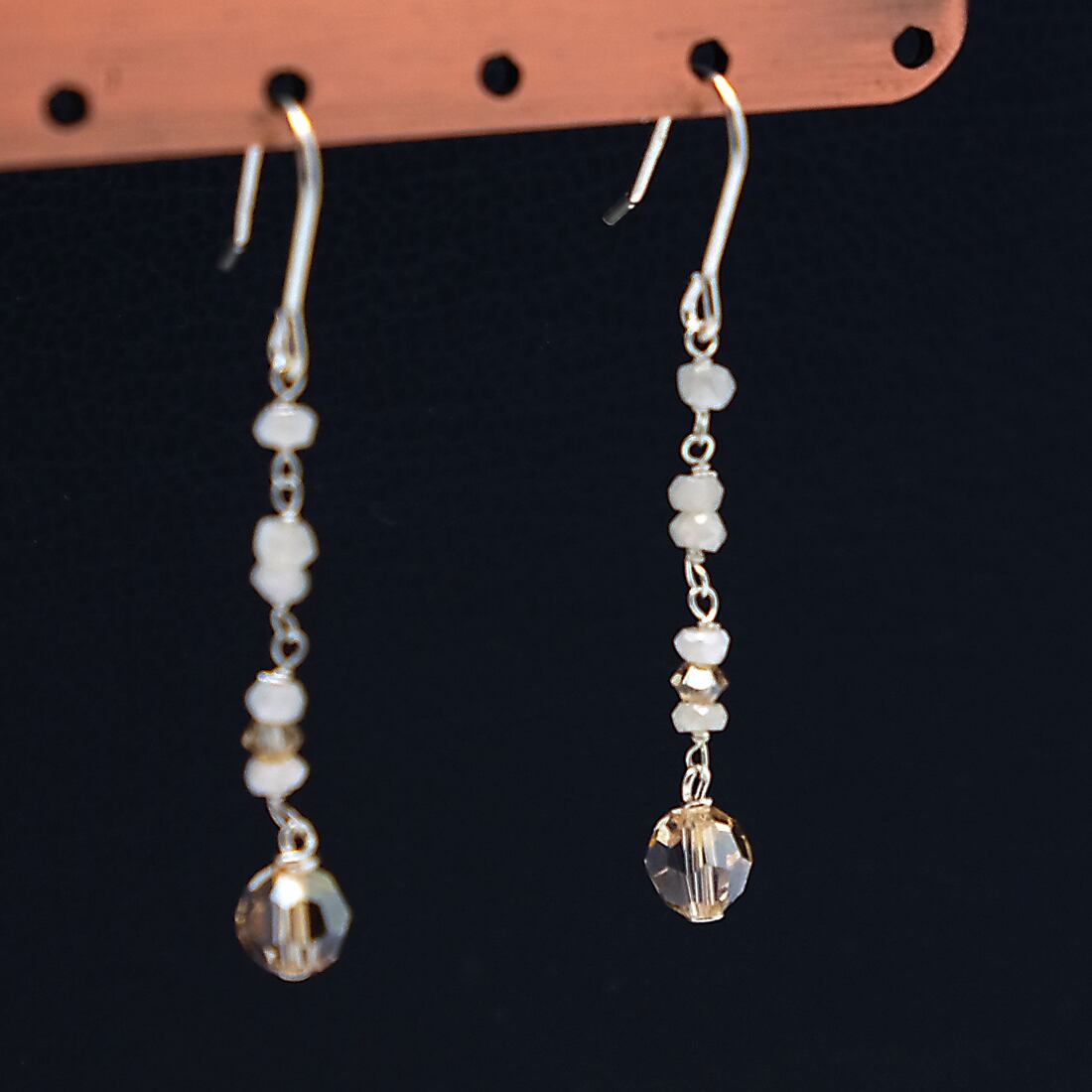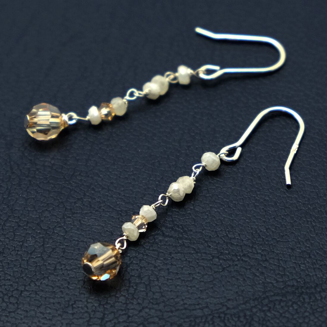 使用している素材/ホワイトシリマナイトボタンカット約3×2mm、スワロフスキー、ピアスフック ※シルバー925 フックを除いた長さ:約35mm 重さ:約1g