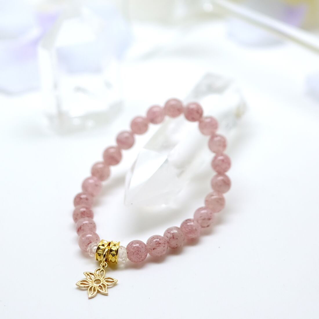 使用している天然石と主な素材/アフリカンストロベリークォーツ《エピドート(緑簾石)》8mmラウンド、クラック水晶6mm多角カット、フラワーメタルチャーム、ラインストーンロンデル、シリコンゴム