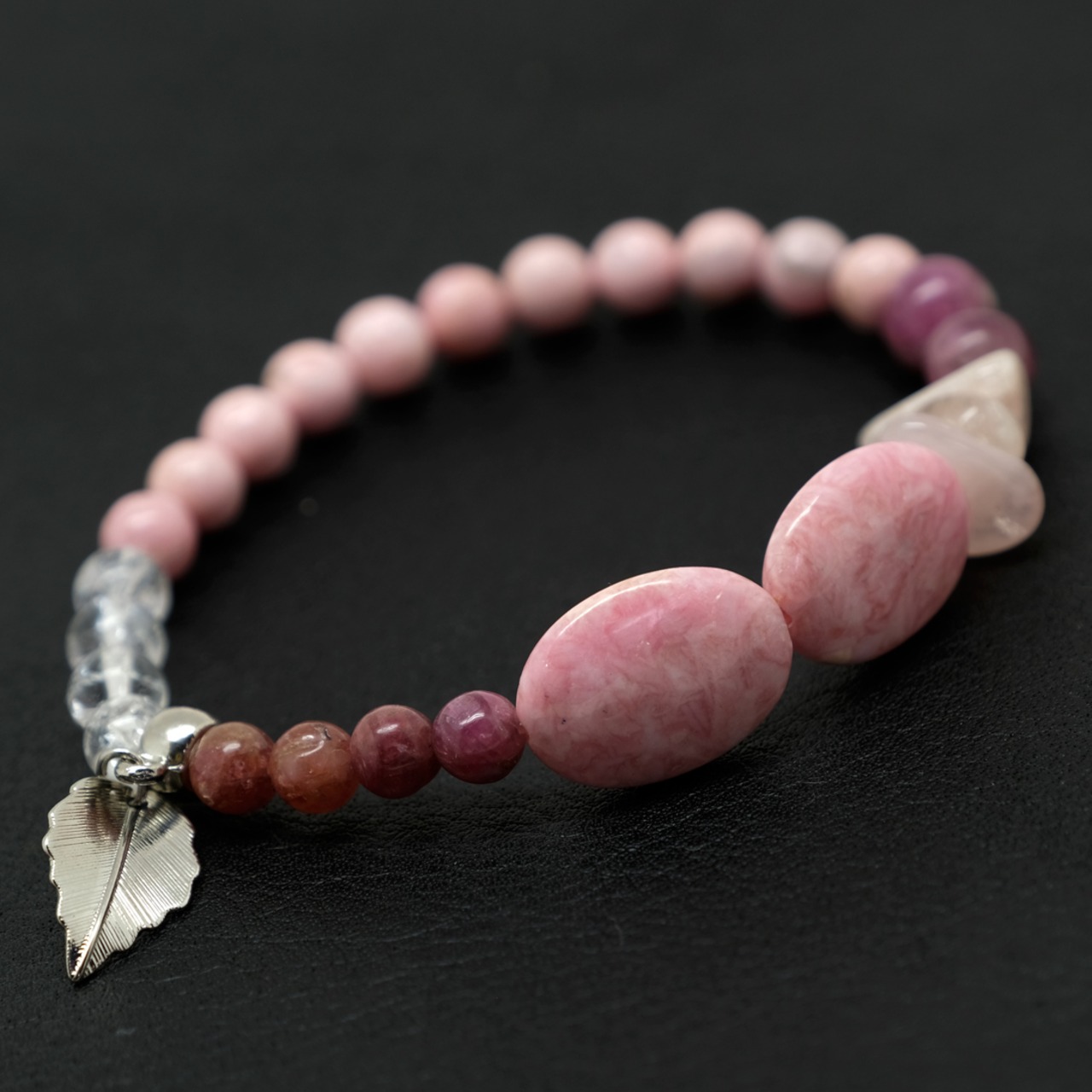 使用している天然石と主な素材/ロードナイト(薔薇輝石) オーバル約18×14×4mm&6mmラウンド、ローズクォーツ(紅水晶)ミニタンブル、ピンクトルマリン(電気石)8mmラウンド&6mmラウンド、クラック水晶6mm多角カット、リーフのシルバーカラーチャーム、シリコンゴム