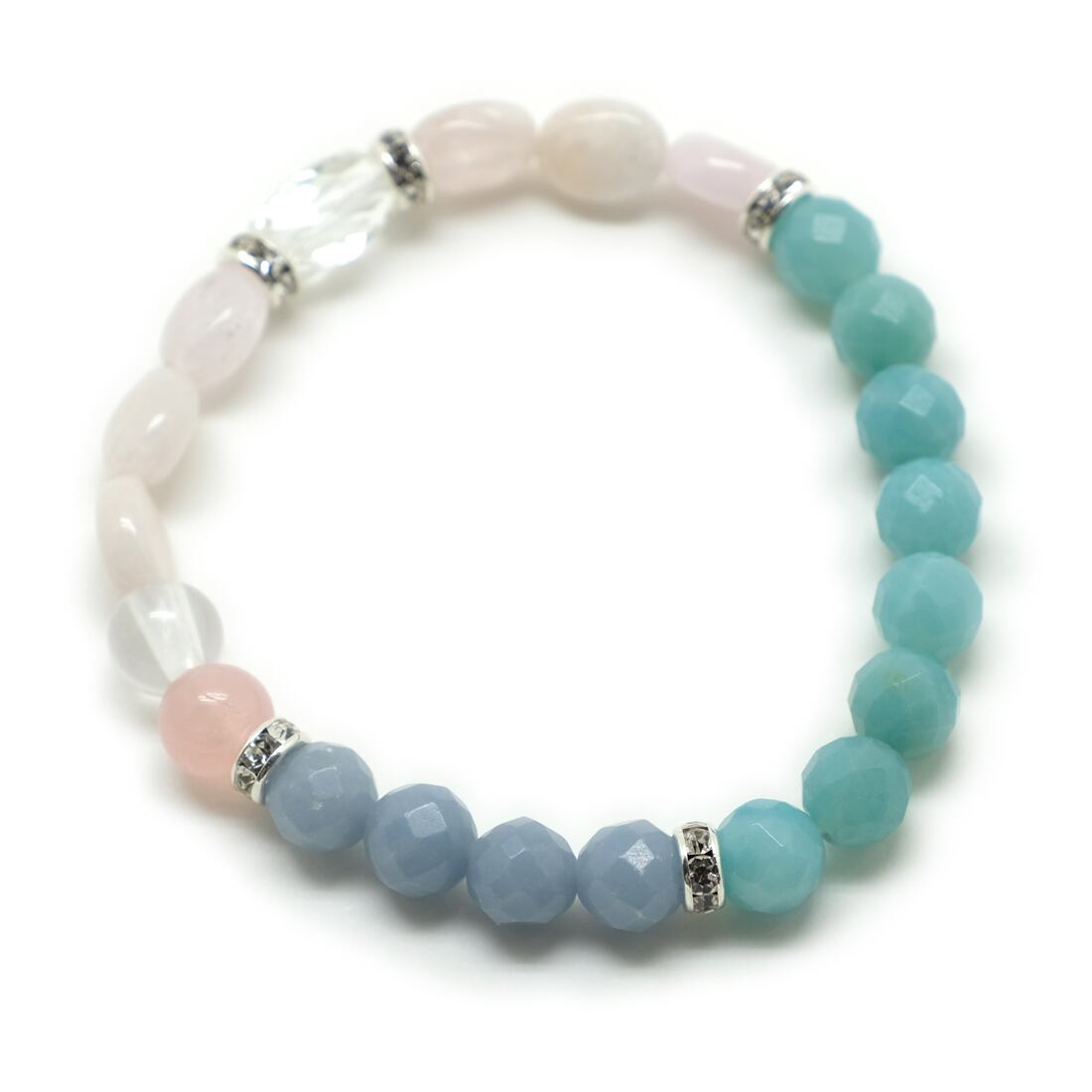 使用している天然石と主な素材/クリスタル水晶ライスカット&8mmラウンド、アマゾナイト(天河石)8mm多角カット、エンジェライト(硬石膏)8mm多角カット、モルガナイト(緑柱石)タンブル〜オーバル約8×6×4mm、マダガスカル産ローズクォーツ(紅水晶)8mmラウンド、ラインストーンロンデル、シリコンゴム