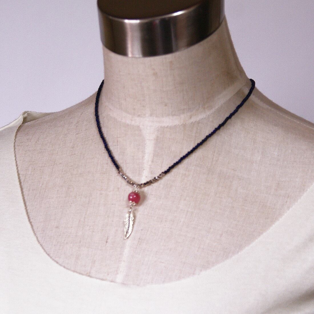 インカローズラウンドとカレンシルバーがポイント、ラピスラズリのネックレスです。