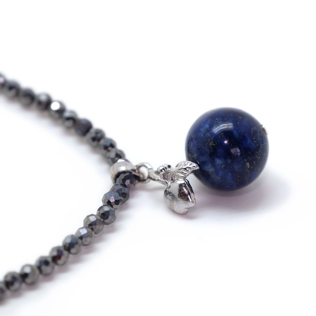 使用している天然石と主な素材/高純度テラヘルツ鉱石 極小約2mm多角カット(材質成分分析試験結果により、成分はSi(ケイ素)ほぼ100%と報告されています) 、ラピスラズリ12mmラウンド、リンゴのバチカン、ヒキワ、アジャスタ ※シルバー925