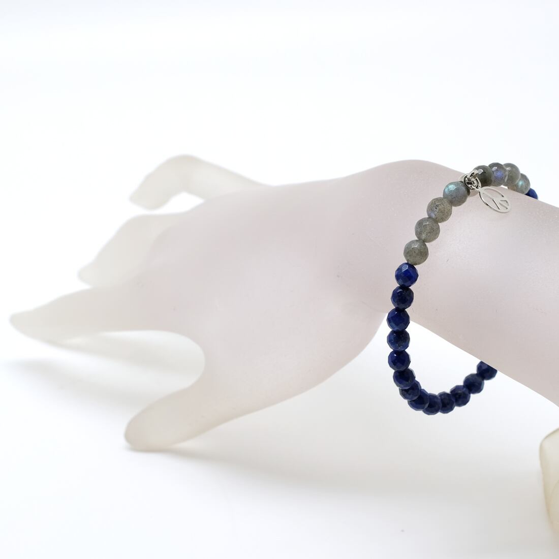 使用している天然石と主な素材/ラブラドライト(曹灰長石)6mm多角カット、ラピスラズリ(瑠璃)6mm多角カット、ピースマークのシルバーメタルチャーム、シリコンゴム