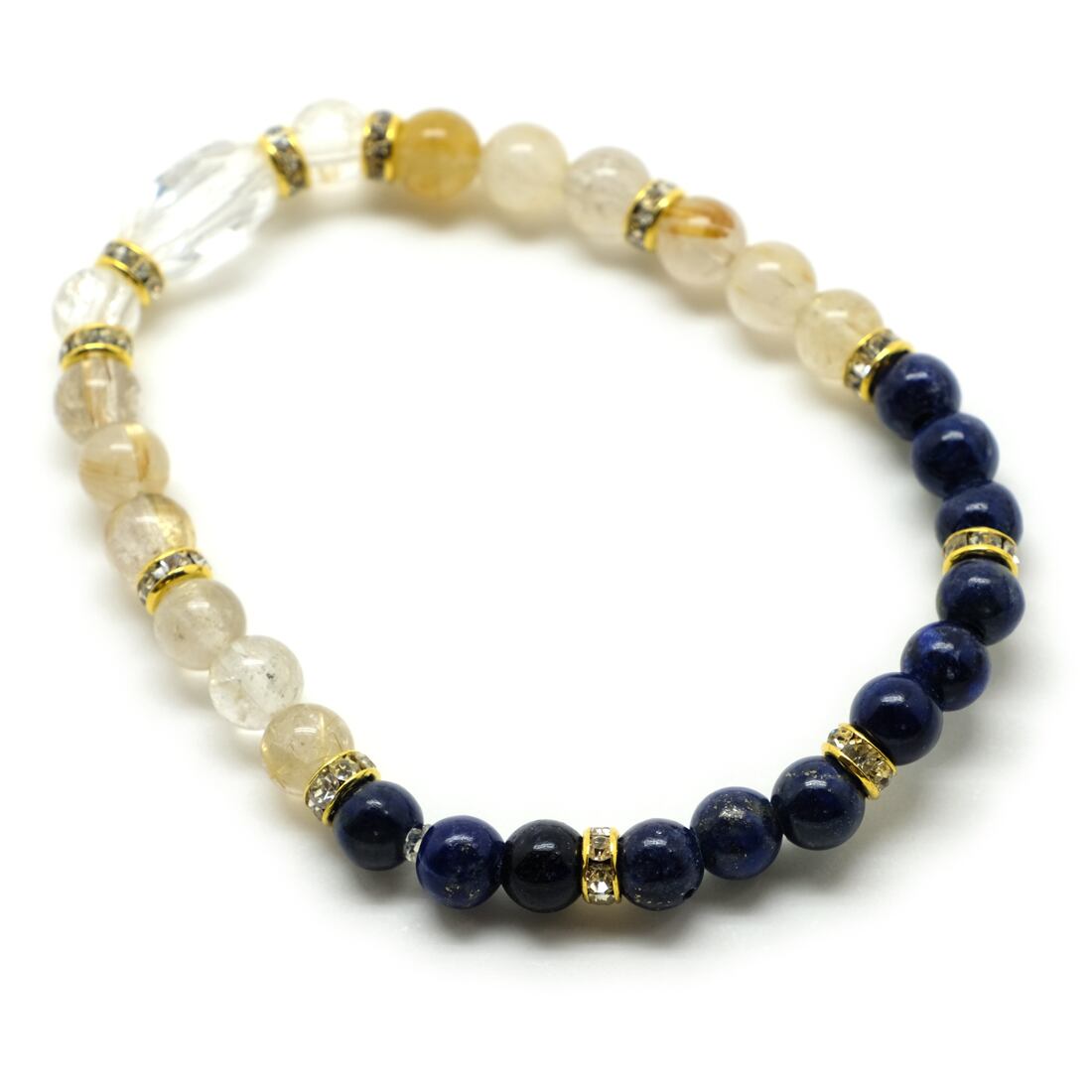 使用している天然石と主な素材/クリスタル水晶ライスカット 約12×8mm、ルチルクォーツ(針水晶)6mmラウンド、ラピスラズリ(瑠璃)6mm多角カット、クラック水晶6mm多角カット、ラインストーンロンデル、シリコンゴム