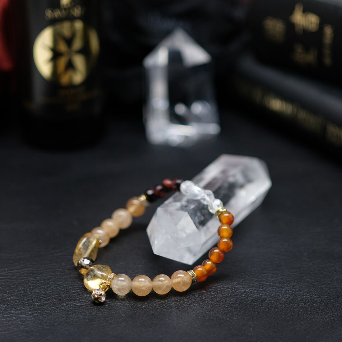 使用している天然石と主な素材/シトリン(黄水晶)タンブル約15×10×6mm、オレンジガーネット(柘榴石)《ヘソナイト》8mmラウンド、スモーキークォーツ(煙水晶)8mm多角カット、カーネリアン(紅玉髄)6mmラウンド、レッドタイガーアイ(虎目石)6mm多角カット、クラック水晶6mm多角カット、キュービックジルコニア付ゴールドカラーメタルチャーム(ラウンドファセットカット4石入)、ラインストーンロンデル、シリコンゴム