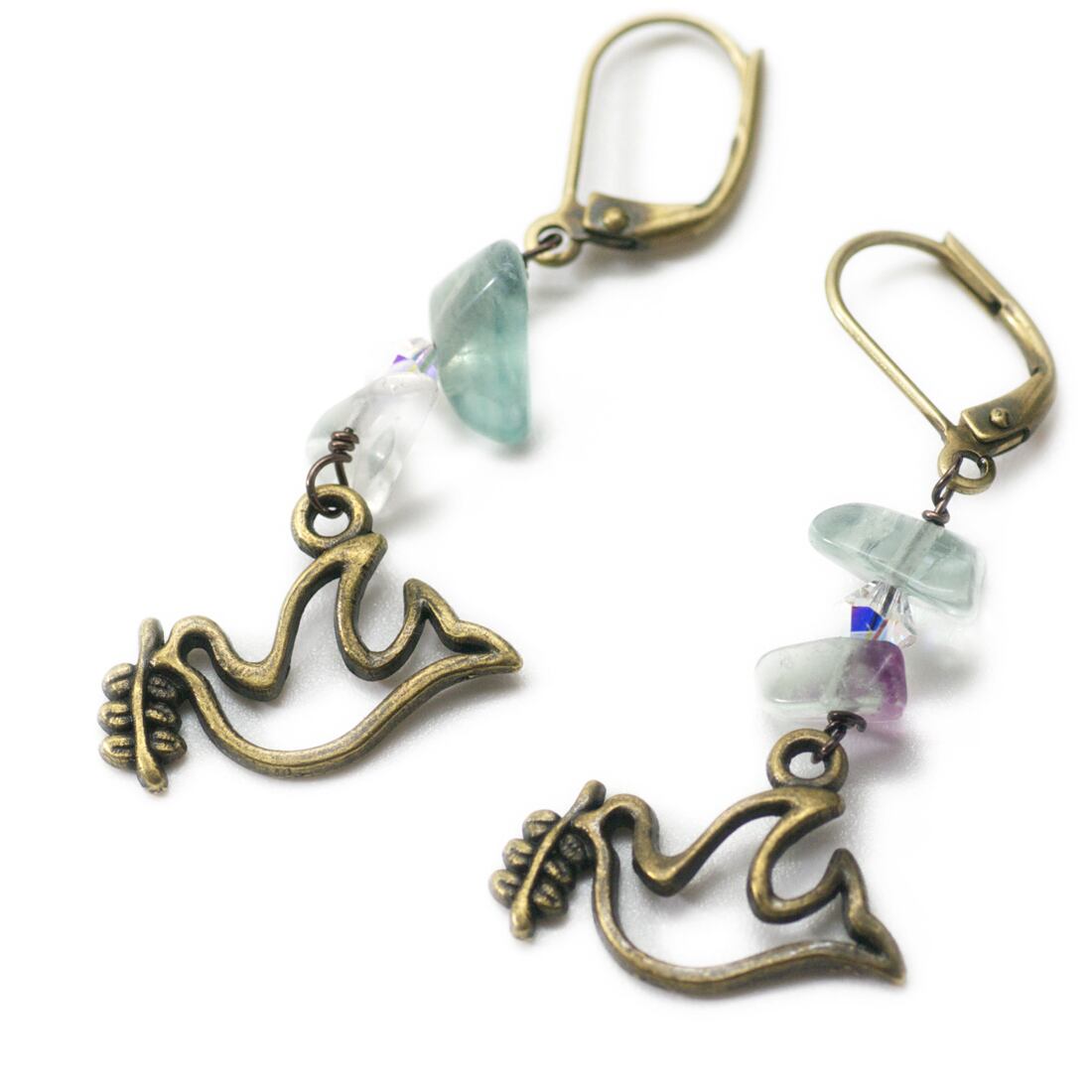 使用している素材/マルチカラーフローライト(蛍石/ほたるいし) ミニタンブル&小粒タンブル、鳩とオリーブのチャーム、スワロフスキー、フレンチフックピアス ※金古美 フックを除くサイズ:約30×20mm 重さ:3g