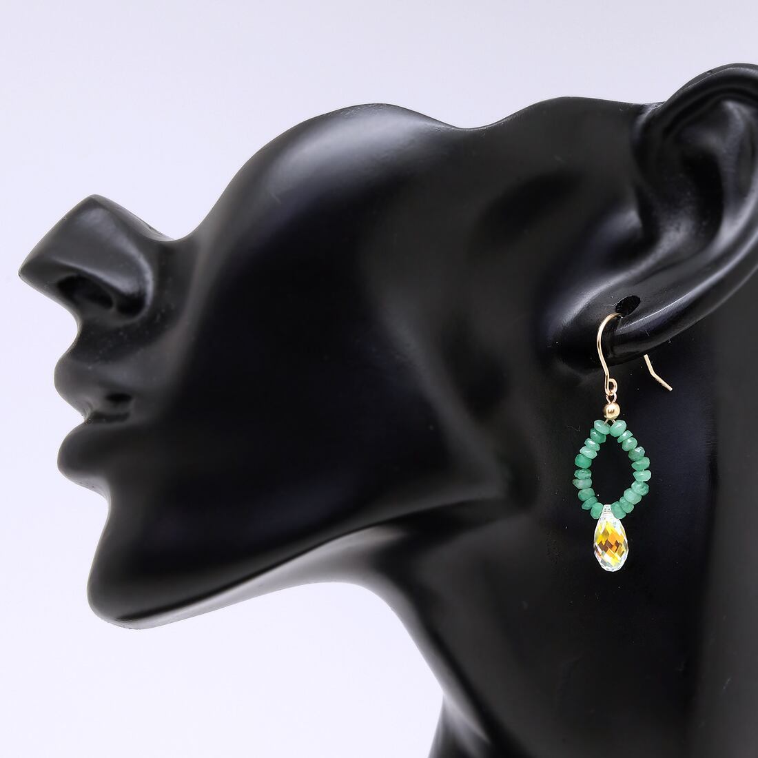 使用している素材/エメラルド ボタンシェイプ 約2~3mm、スワロフスキーシズクカットクリスタルAB約11×5mm、ピアスフック ※14金ゴールドフィルド