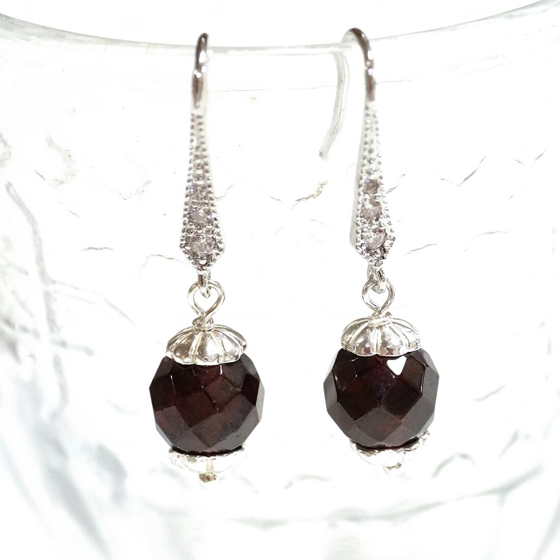 使用している素材/ガーネット8mm多角カット、キュービックジルコニア付きピアスフック、花座 ※シルバー925