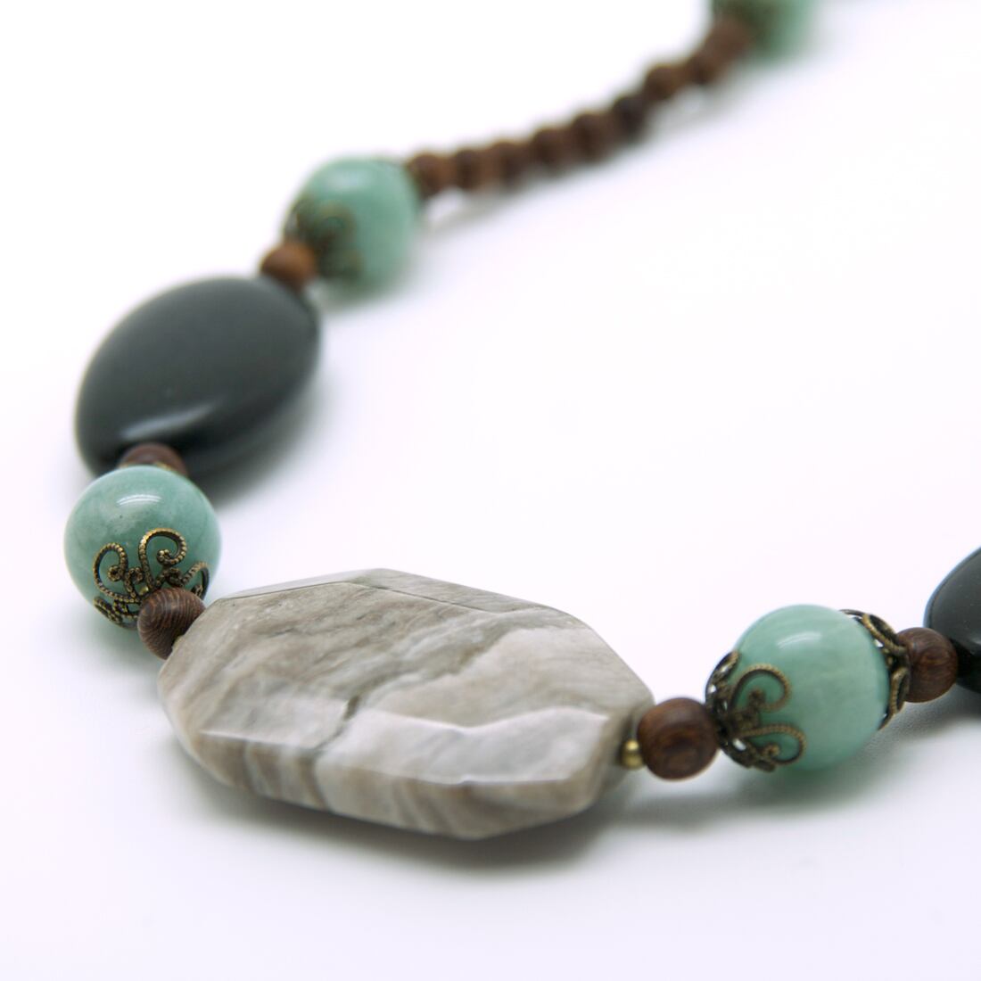 使用している天然石と主な素材/シルバーリーフジャスパー フラットタンブルカット約40×30×10mm、ロシアンアマゾナイト14mmラウンド、ウッドオーバル30×20×8mm、ウッド6mmラウンド、花座、透かし飾りクラスプ(抜き差しするタイプの留め具)
