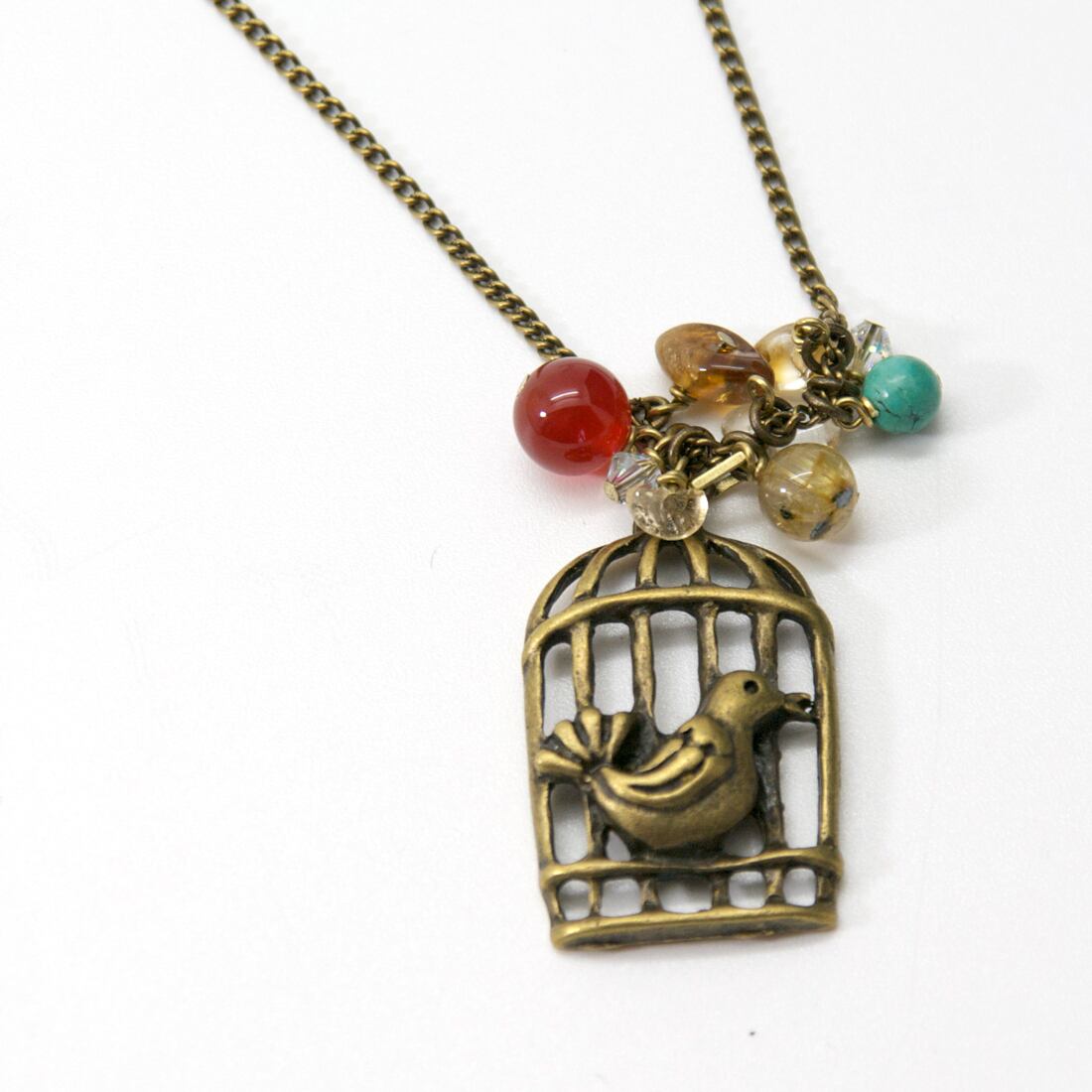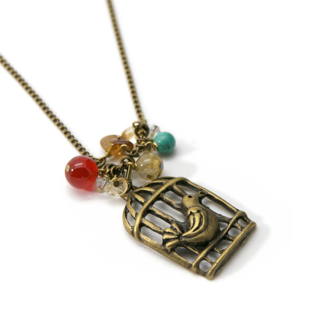 使用している天然石と主な素材/ターコイズ6mmラウンド、ルチルクォーツ8mmラウンド、シトリンミニタンブル、レッドアゲート8mmラウンド、スワロフスキー、鳥かごのチャーム 35×22mm、アズキチェーン、ヒキワ、板カン ※金古美