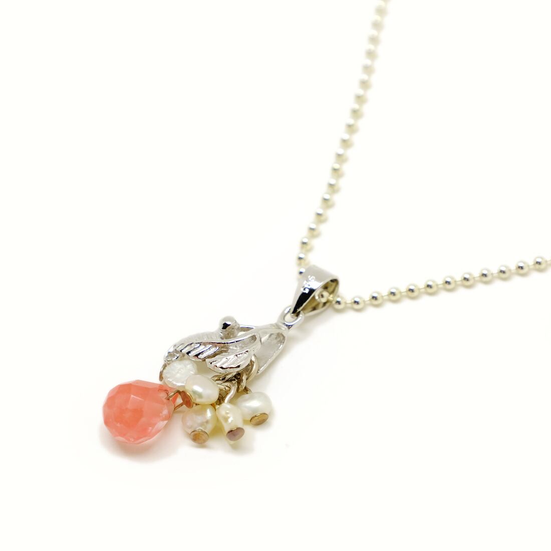 使用している天然石と主な素材/チェリークォーツブリオレットカット約8×10mm、小粒淡水パール(ケシ)、リーフ(葉)彫刻の飾りバチカン、40cmボールチェーンネックレス ※シルバー925