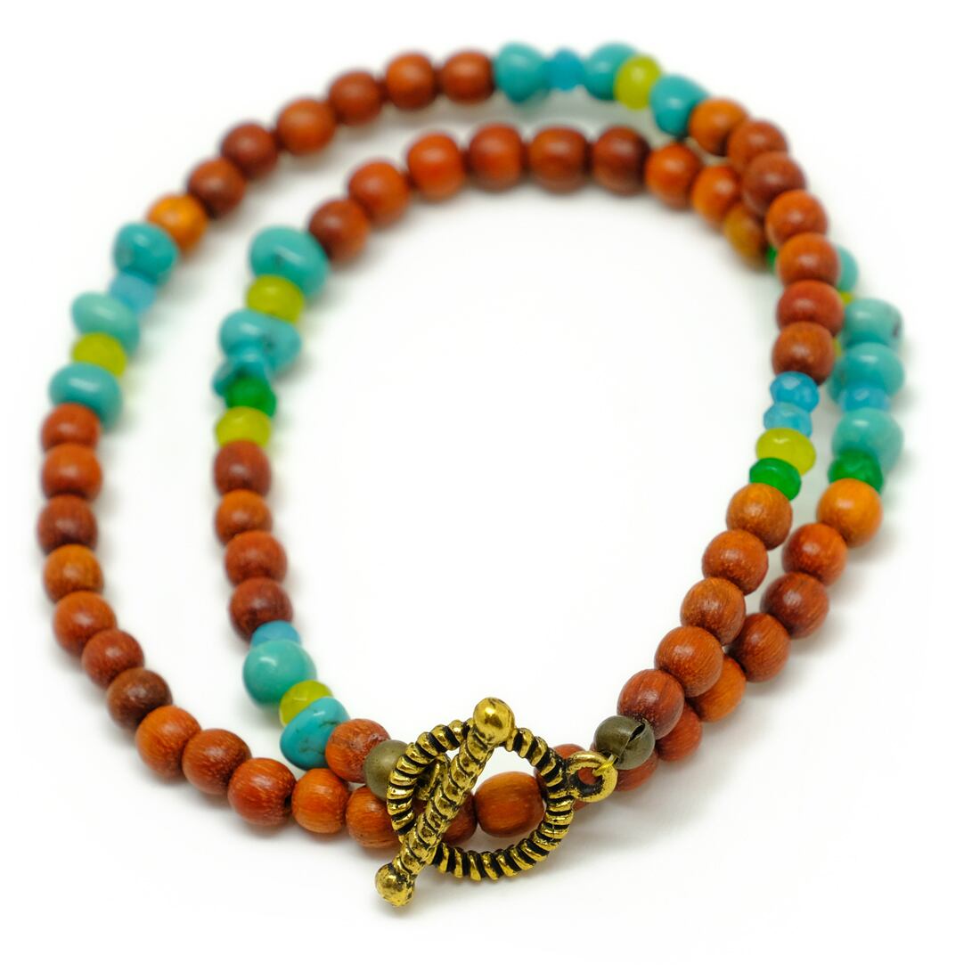 使用している天然石と主な素材/レッドウッドビーズセミラウンド約4mm、ターコイズ(トルコ石)ミニタンブル、オリーブジェイド(蛇紋石)&ブルージェイド(珪石)ボタンカット約4×3mm、ロンデル、マンテル ※アンティーク調メッキ(金古美)