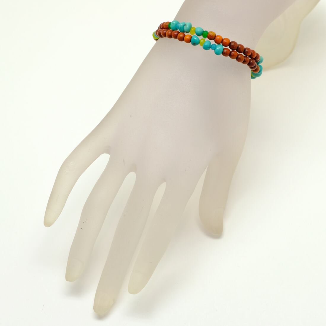 レッドカラーのウッドとブルー&イエローの天然石を組み合わせたナチュラルテイストのブレスレットです。