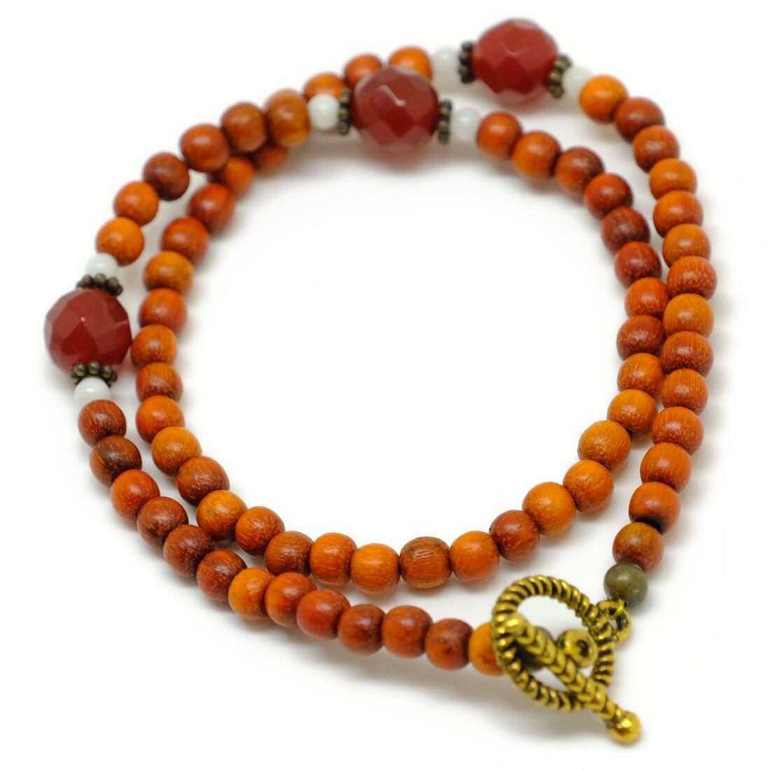 レッドカラーのウッドと赤めのうを組み合わせたナチュラル感あふれるブレスレットです。