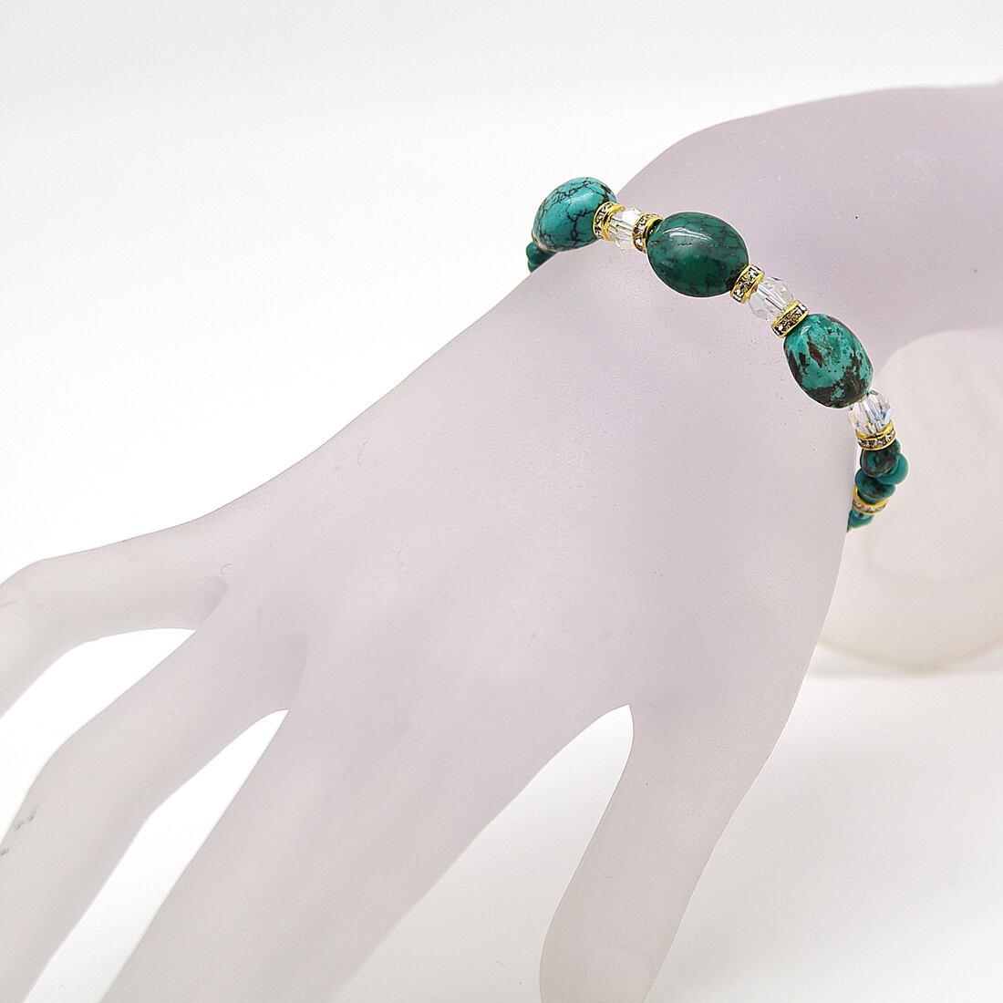 不揃いのタンブルシェイプのターコイズとスワロフスキーを組み合わせたブレスレットです。