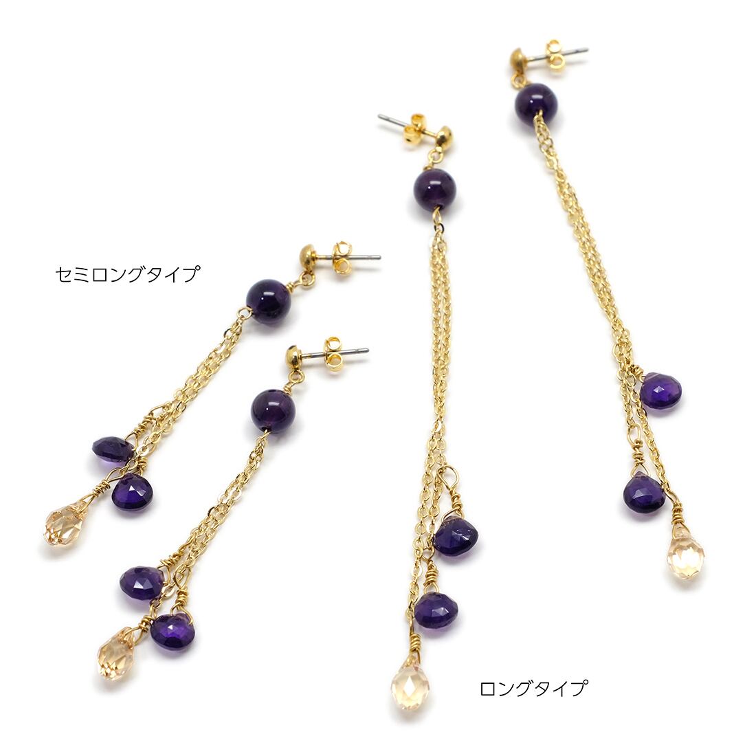 アメジストとスワロフスキーを組み合わせたピアスです。長さ違いでお選びいただけます。
