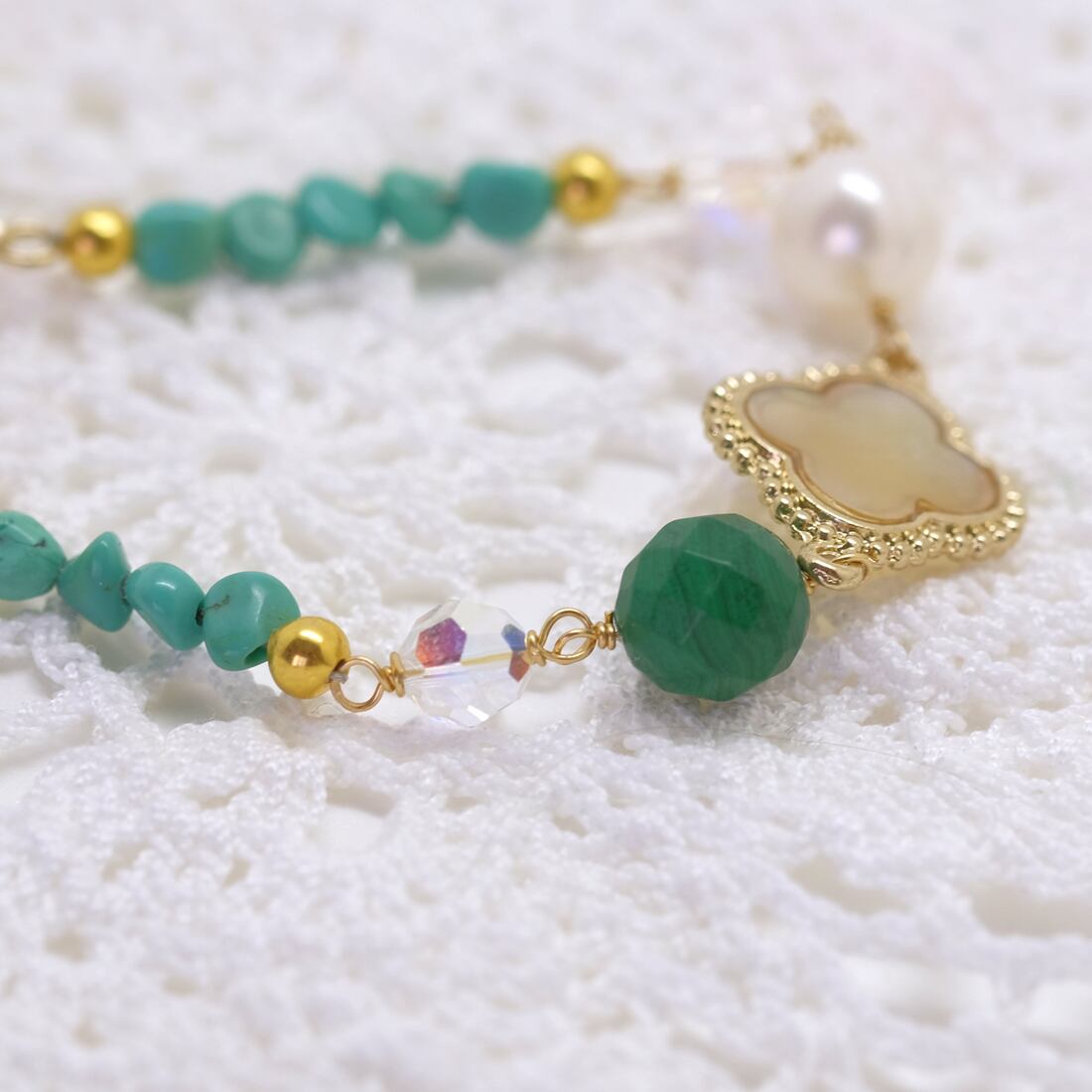 使用している天然石と主な素材/クローバーシェイプパーツ/シェル15×15×1.5mm 、淡水パール(スジあり)、マラカイト8mm多角カット、アクア水晶6mm多角カット、ターコイズミニタンブル、アジャスタ、カニカン ※ゴールドメッキ