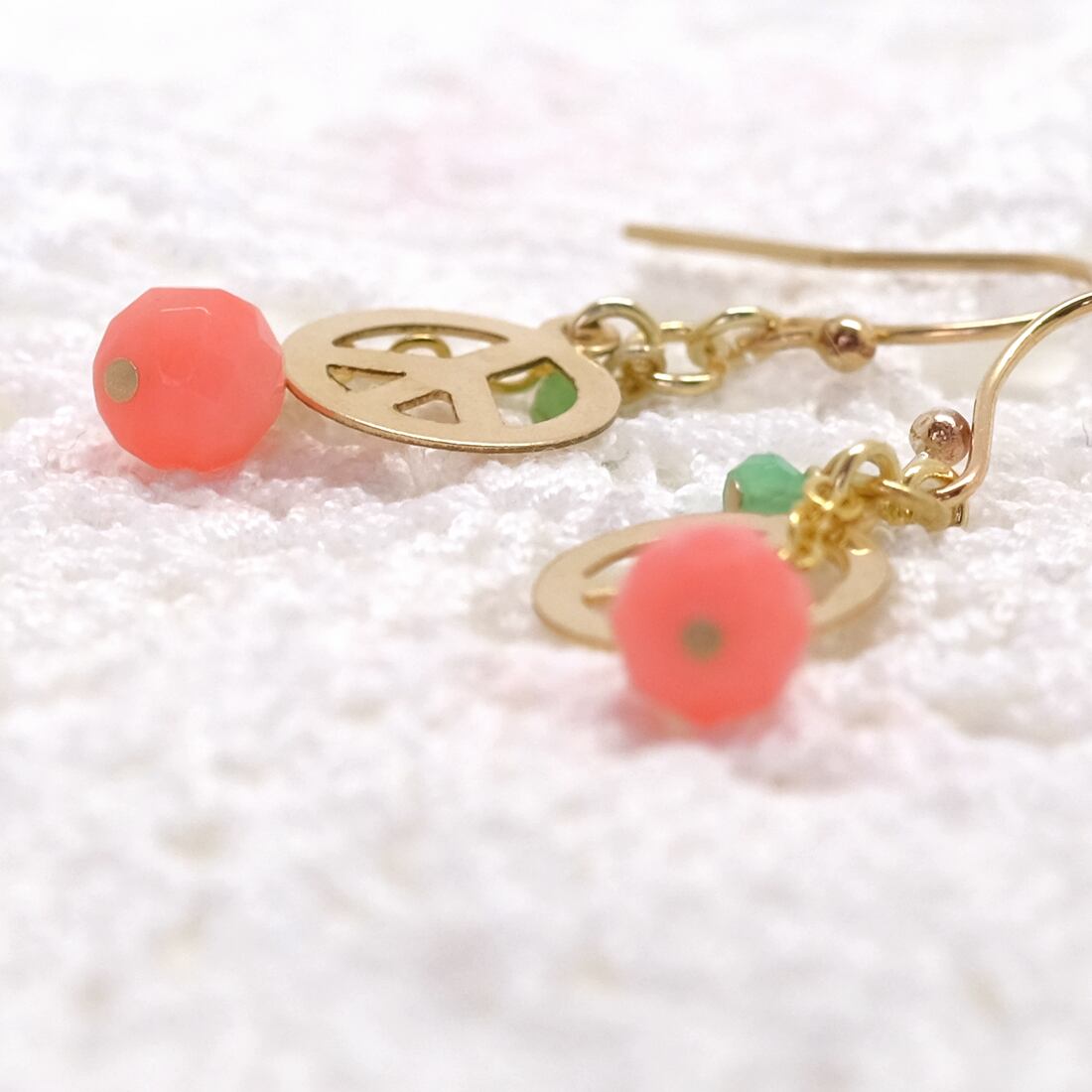 平和を願うピースチャームとピンクコーラルを組み合わせたスイングピアスです。