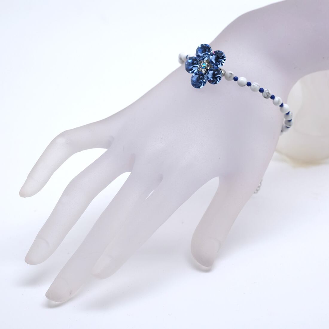 キラキラと輝くカットガラスのお花をポイントにラピスラズリとハウライトを組み合わせたブレスレットです。つけはずしが楽なマグネットタイプです。※マグネットの付け根でチェーンがつながっているので、落下防止になります。