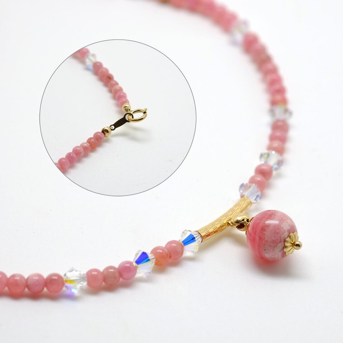『薔薇色の人生』を象徴する希少石、アルゼンチン産インカローズのネックレスです。胸元を可愛らしく華やかに演出してくれるでしょう。