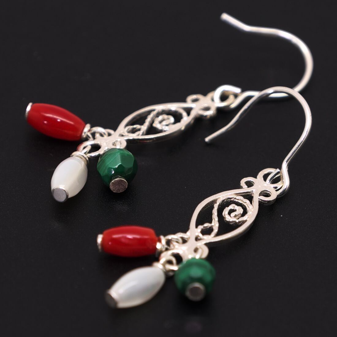 使用している素材/レッドコーラル(染め紅珊瑚)ナツメ(6×3mm)、マラカイト4mm多角カット、マザーオブパールライスカット約7×2.5mm、シルバーリンク約18.5×6×0.7mm、ピアスフック ※シルバー925
