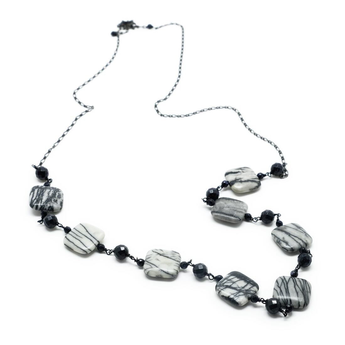 使用している天然石と主な素材/ゼブラジャスパー スクエア約20×20×4mm、ブルーゴールドストーン(紫金石※ブルーゴールドストーンは中にキラキラとした輝きをもつ人工石(ガラス)です)8mm&4mm多角カット、ブラックカラーメタルフィガロチェーン幅2.5mm、カニカン