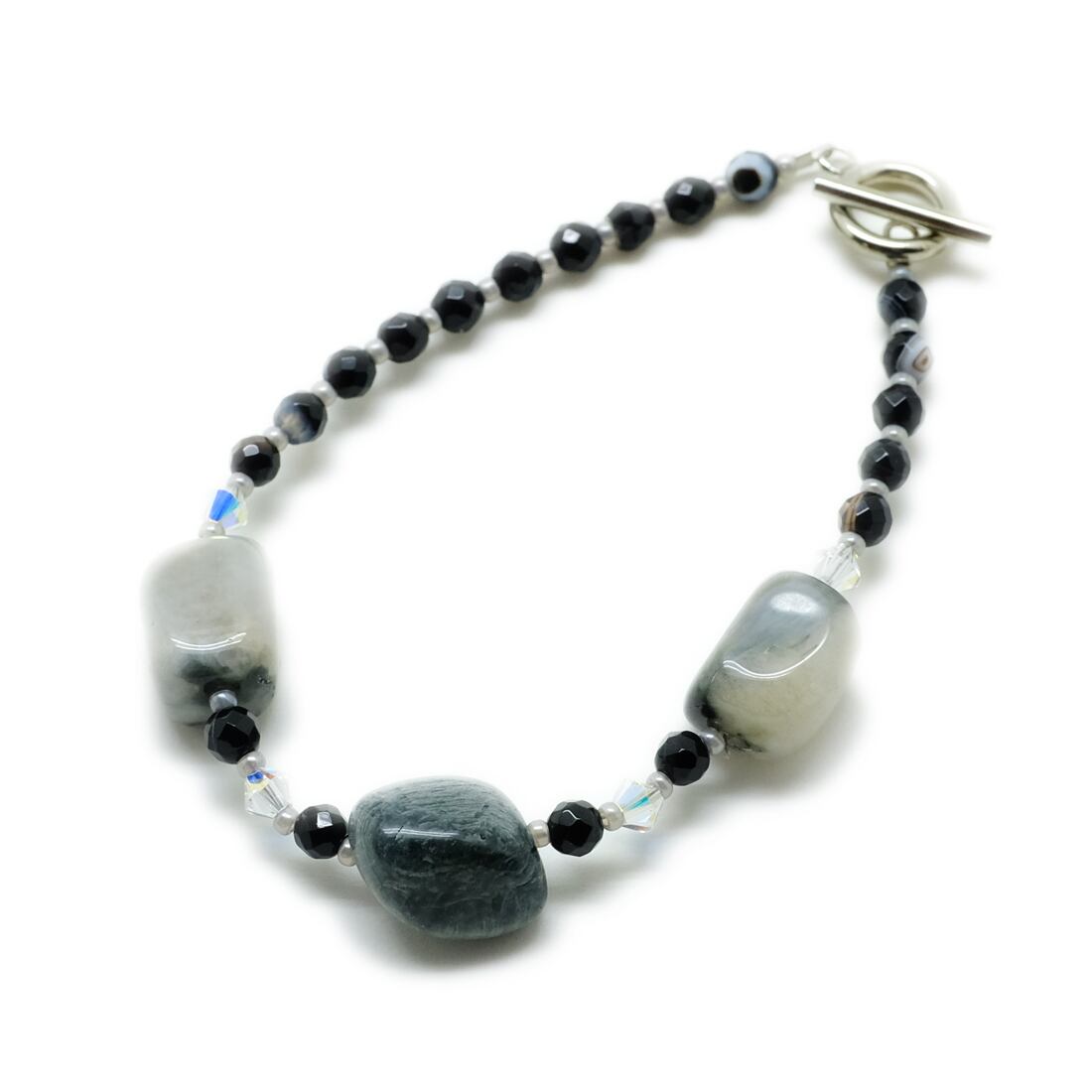 主な使用素材/イーグルアイ (鷹目石/たかめいし)約4mmmミラーカット&タンブル約12~16mm、MIYUKIビーズ丸小、スワロフスキー クリスタルAB4mm、マンテル ※ロジウムメッキ