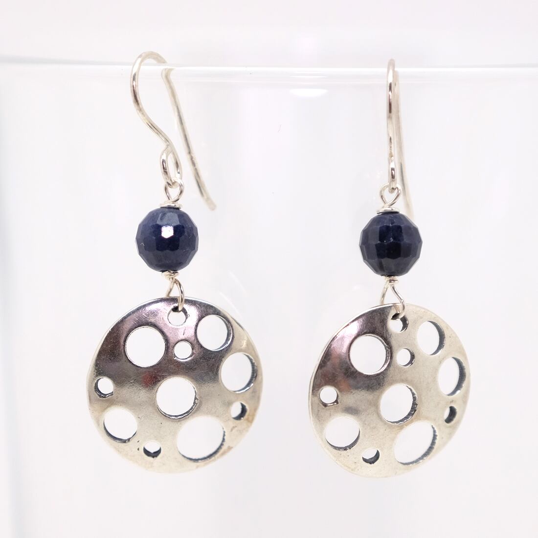 ユニークなシルバーの穴あきパーツとブルーサファイアを組み合わせたピアスです。
