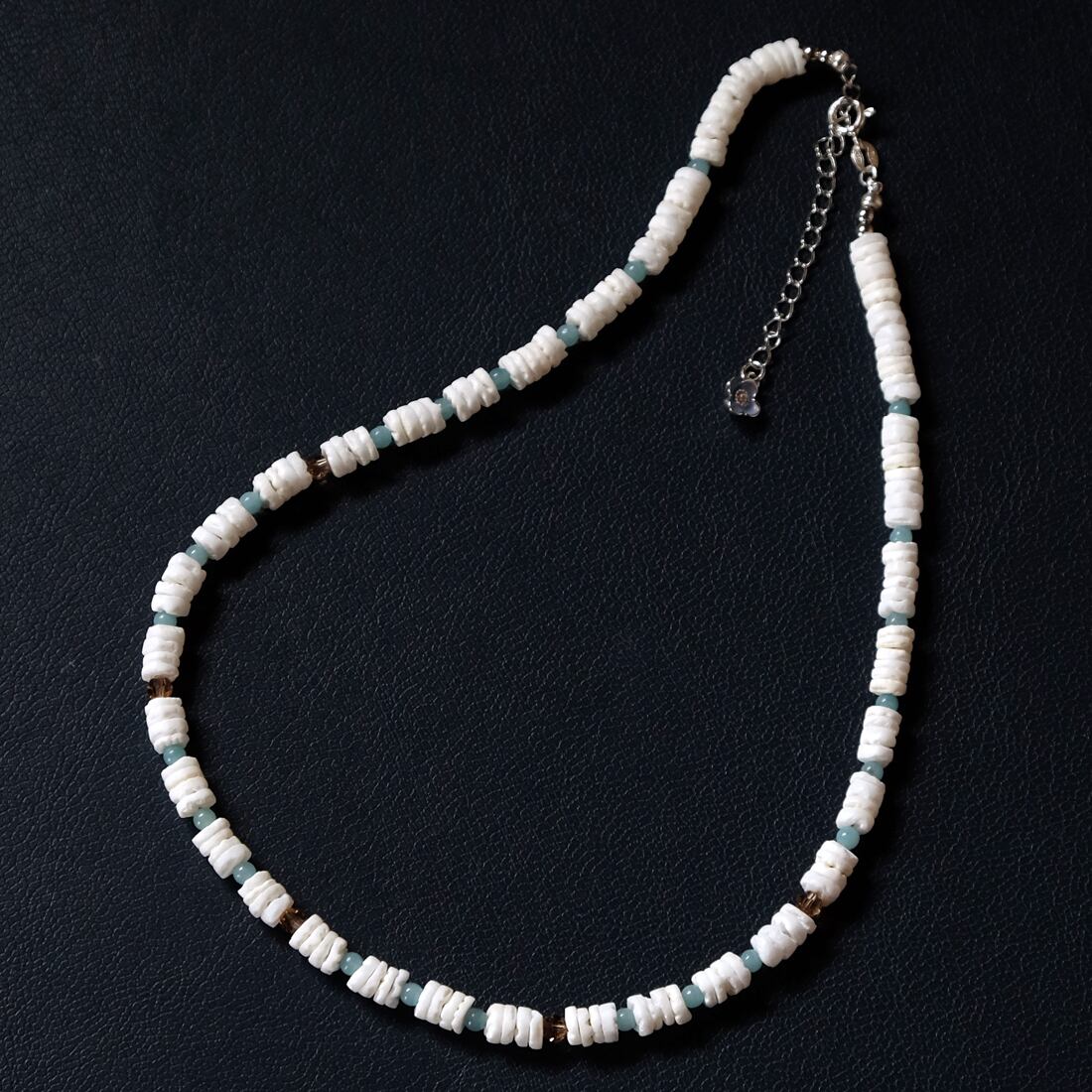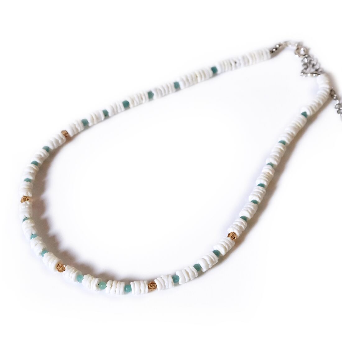 チューブ形状のシェルとアマゾナイトを組み合わせたネックレスです。