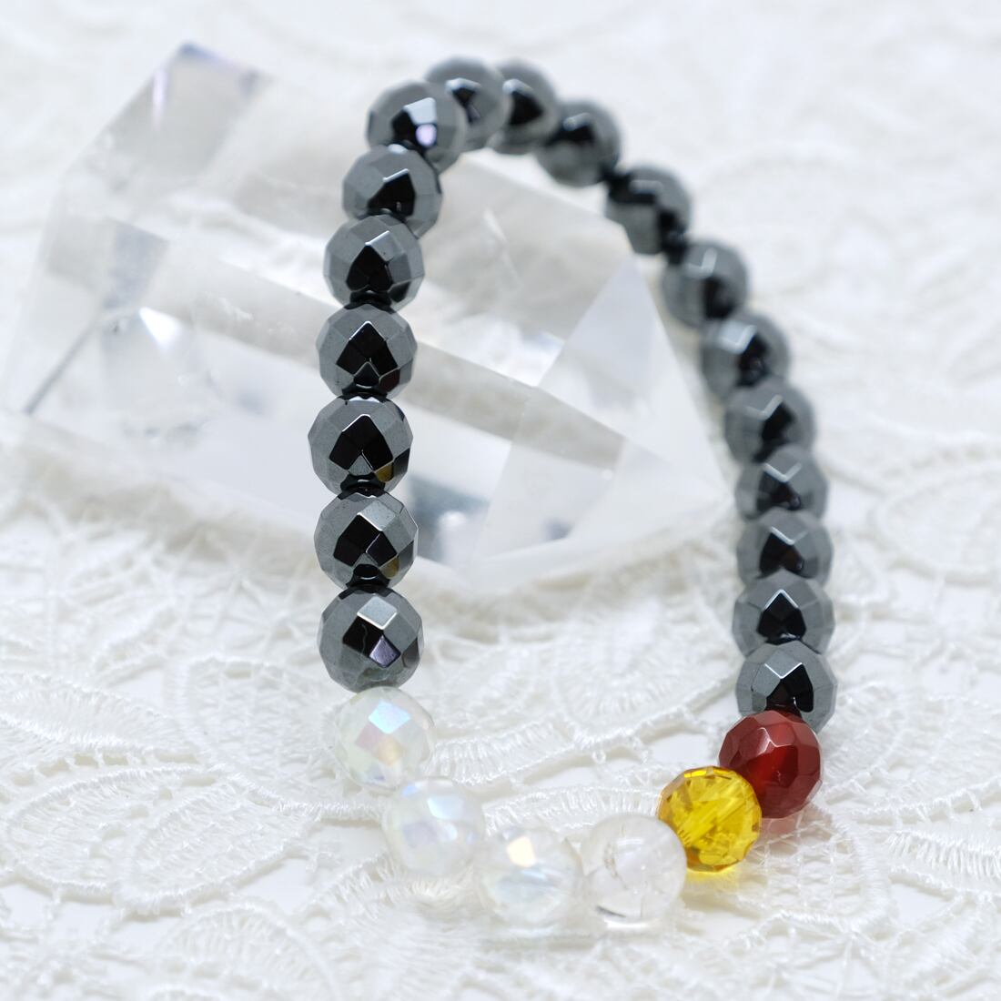 使用している天然石と主な素材/ヘマタイト(赤鉄鉱)8mm多角カット、アクアクリスタル(表面にチタン蒸着加工を施しシャボン玉のような光を放つ水晶です)8mm多角カット、クラック水晶8mmラウンド、カーネリアン8mm多角カット、シトリントパーズ(黄水晶)8mm多角カット、シリコンゴム