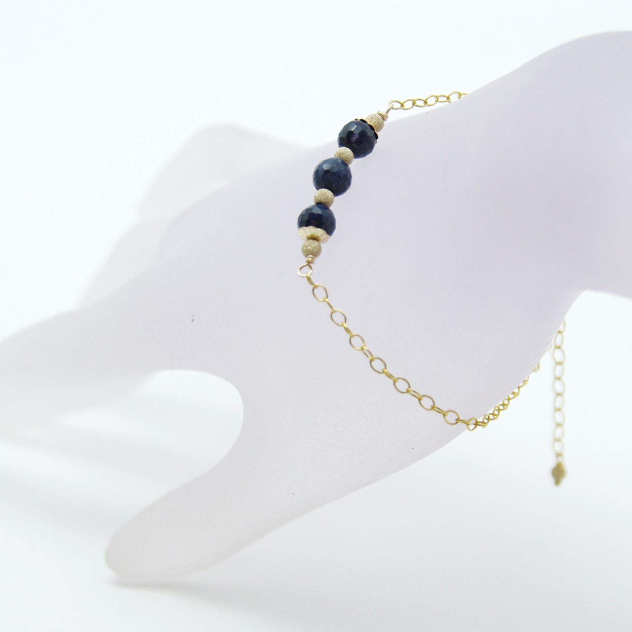 カット面がキラキラ輝くサファイア6mmラウンドカットをポイントにしたシンプルなゴールドチェーンブレスレットです。