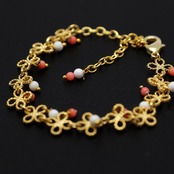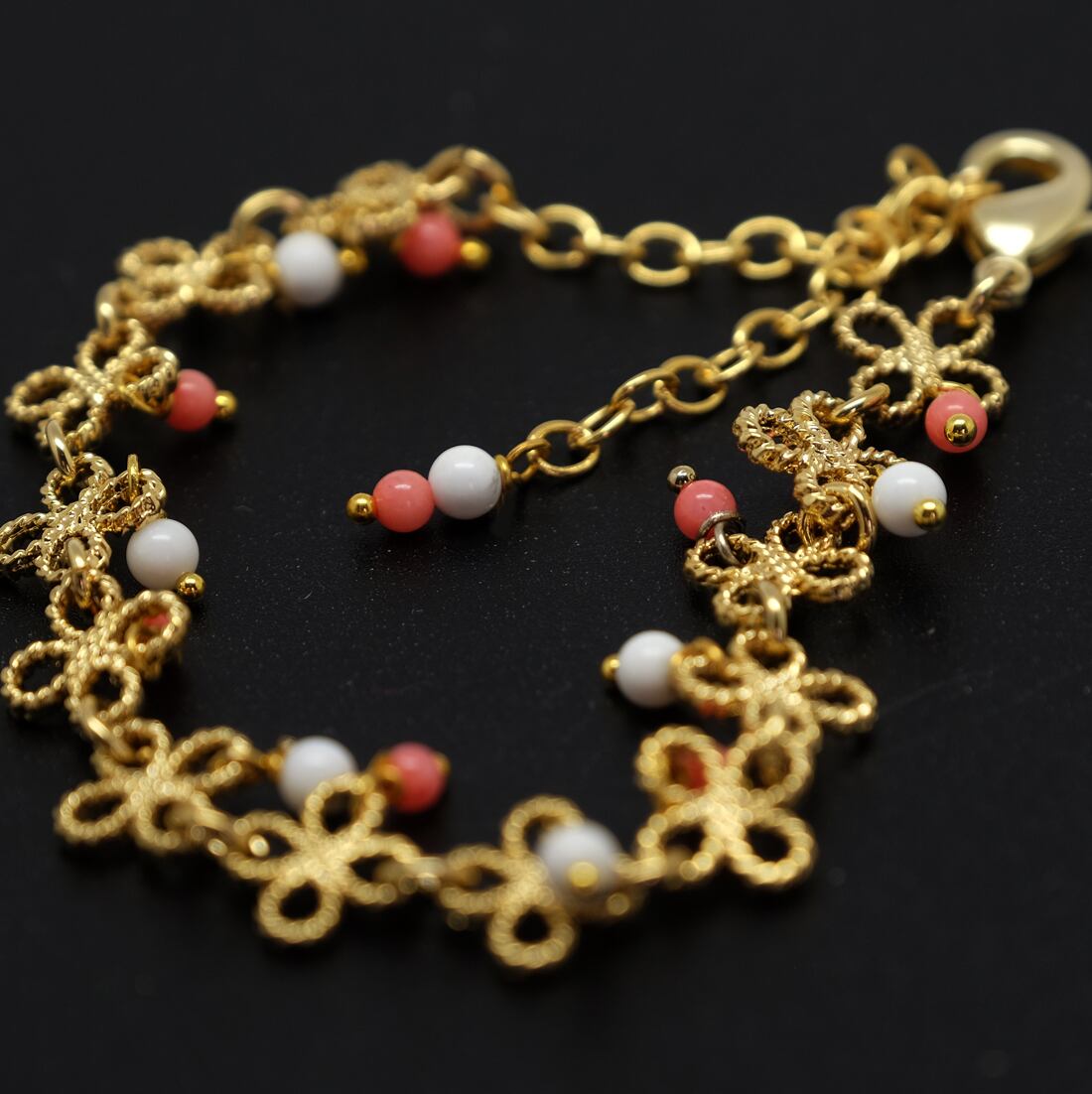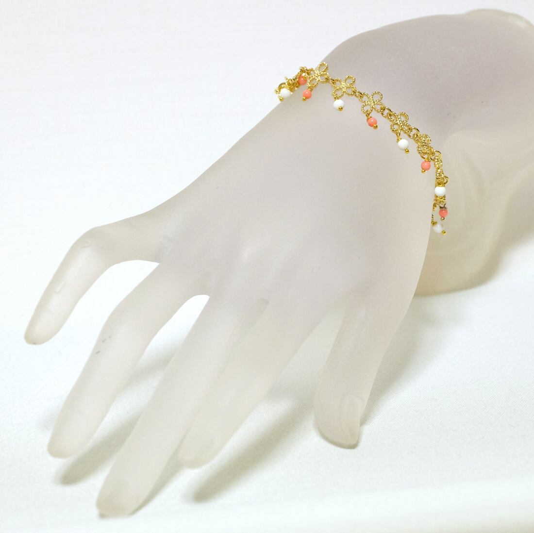 フラワーチェーンと天然石のブレス/ピンクコーラル&ホワイトオニキス