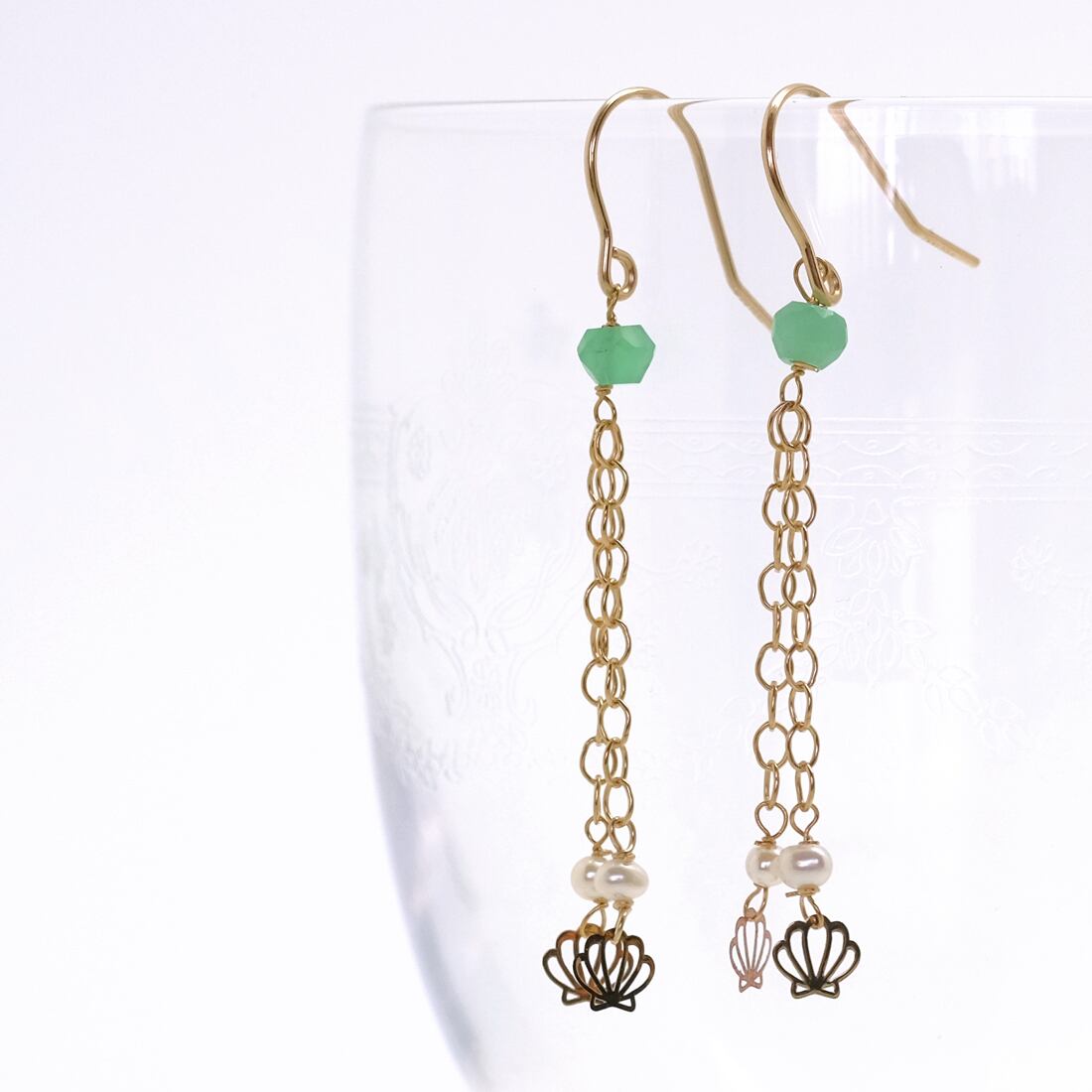 使用している天然石と主な素材/クリソプレーズ (緑玉髄)ボタンカット約2.5×2mm、淡水パール(ケシ)、アズキチェーン、ホタテのパーツ、ピアスフック ※14金ゴールドフィルド