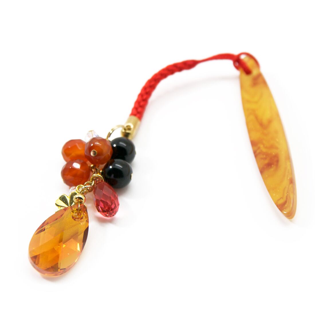使用している天然石と主な素材/カーネリアン8mm多角カット&4mmラウンド,ブラックトルマリンAAA 8mmラウンド、ラメ入り樹脂帯飾りプレート、根付け紐、スワロフスキー(4mm、大粒ドロップ22×12×7mm、中粒ドロップ11×5.5×5.5mm)、クローバーチャーム ※ゴールドメッキ ※帯飾りプレートの模様は商品により若干異なります。 長さ:約17cm(飾り部分:約5cm) 重さ:10g