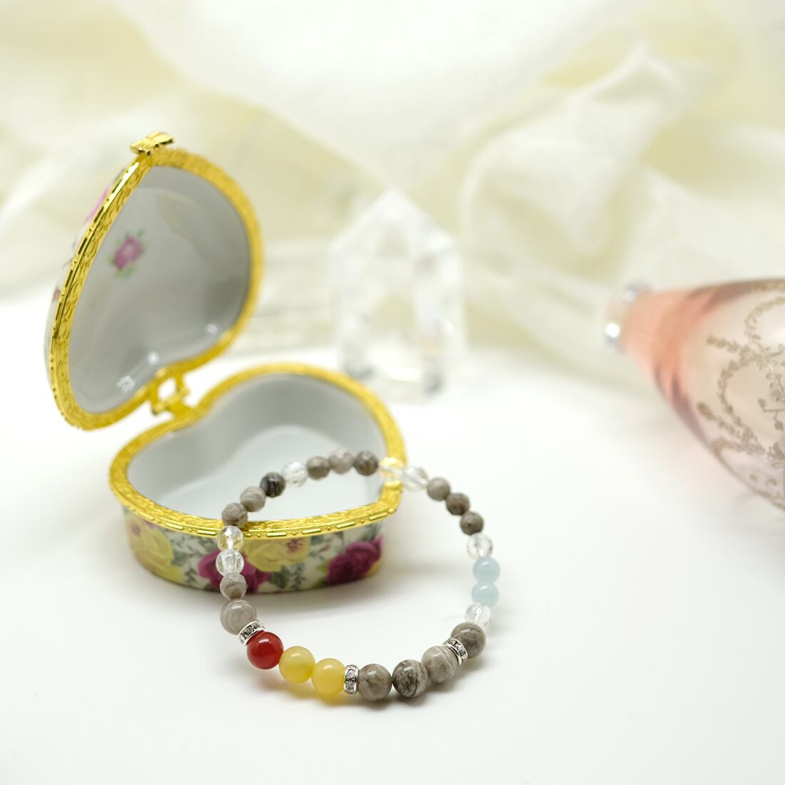 シルバーリーフジャスパーのグレーとホワイトの模様は、自然の模様そのまま。アラゴナイトのやわらかいピンクとグリーンの色合いが、シルバーリーフジャスパーと調和を奏でます。手首に巻けば、優雅な気分に包まれます。