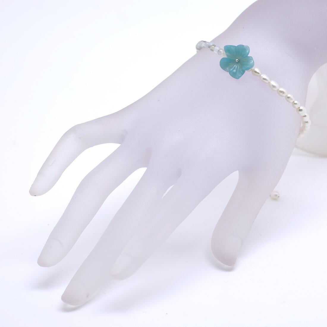 お花の形にカットした天然石アマゾナイトと淡水パールやアクアマリンなどの小粒天然石を組み合わせた癒しのパワーあふれるブレスレットです。