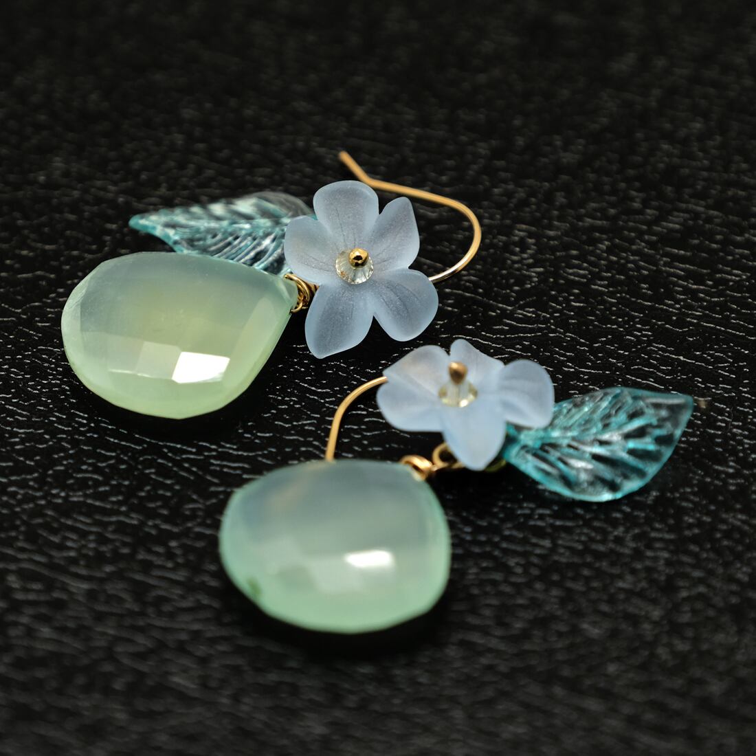 プルメリアのお花のパーツに大粒グリーンカルセドニーのドロップを組み合わせたピアスです。爽やかな可愛らしさが魅力♪