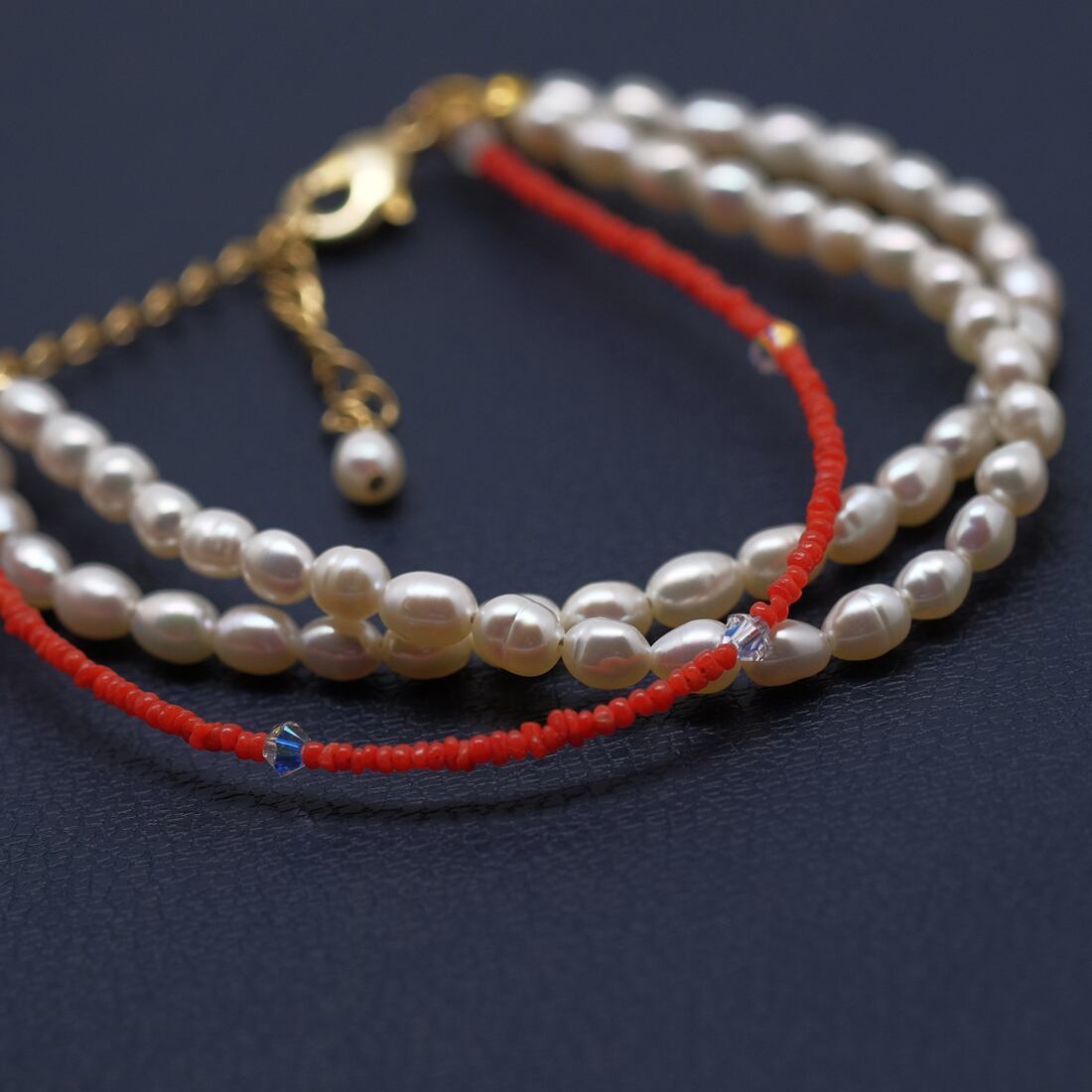 使用している天然石と主な素材/サルデーニャ産本珊瑚AAA 小粒ロンデル 約1~1.5×1mm 、ホワイト淡水パールライス約5×3mm使用(スジ、凹み等がございます)、スワロフスキー、カニカン ※ゴールドメッキ
